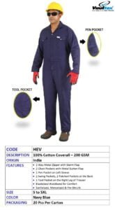 100% COTTON COVERALL 200 GSM WITH PEN AND TOOLS POCKET, SIZE – S TO 5XL, COLOR – NAVY BLUE, MODEL – HEV, ORIGIN – INDIA